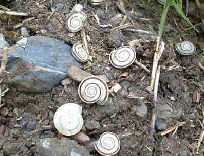 上が平らなカタツムリ、カドバリヒメマイマイと言いますが これもこの山固有の動物です。 |
