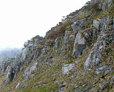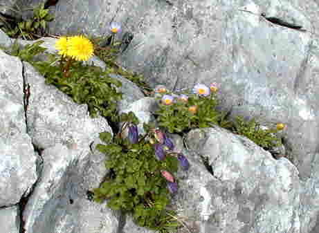 | この白い石灰岩は一億年年以上前太平洋の底でできたという話です。 ミヤマオダマキ、オオヒラタンポポ、ミヤマアズマギクがきれいでした。 |