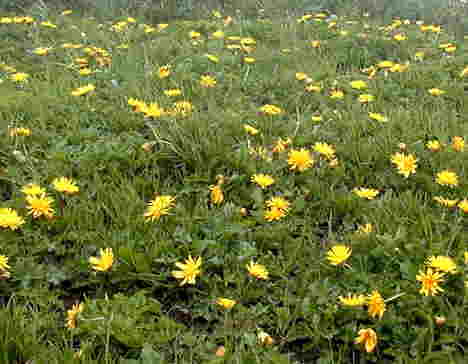 | 石灰岩が路頭をしているため特殊な植物が自生しています。 | 固有種オオヒラタンポポは満開です。 |