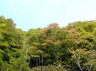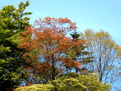 イタヤカエデの芽吹きはまるで紅葉のようです。 | 標高三百メートルくらいのところが、 今ブナの新緑が真っ盛かりです。 |