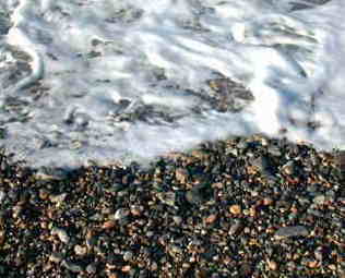 | 積雪は四、五十センチ例年の半分くらいです。 | 海岸への傾斜護岸も雪の下 | 波打ち際は,とってもきれいな玉砂利 よく探すと、メノウ ジャスパーも落ちています。 |