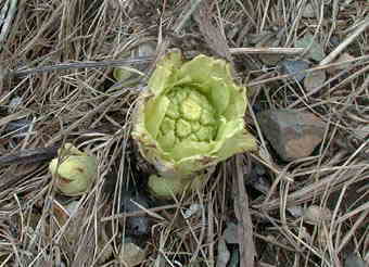 | あわ雪の残る中かたくりのつぼみもふくらんできました。 | 左からアサツキ シャク ギョウジャニンニク フキノトウ 例年よりずいぶん早い春の恵みです |