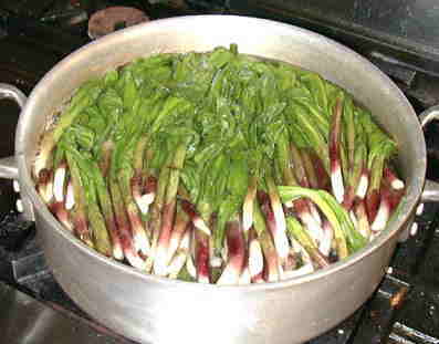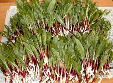 | 今が旬の行者ニンニク今日はたくさんとれました。 | さっと湯がくのですが、、なかなか強烈な臭いです。 |