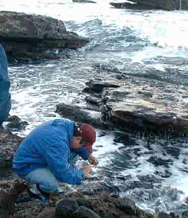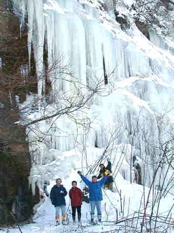 | トンネルを抜けると、海岸の断崖に大きな氷の滝ができています。 | 海岸の岩の上には、、、、 |