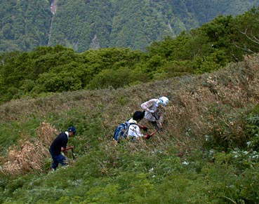又キリギシ山が、一昨年から登山禁止になったこともあり、そのことでこの山がマスコミに取り上げられたりしたもこともあり、登る人が急に増加し踏み荒らしによる被害も拡大し早急に手を打たないと、取り返しのつかない状態です。特に一番お花のきれいな、八号目のピークのすぐ手前はルートがはっきりしていないため、またそこが非常に崩れやすいためもあり、横一列でお花畑をつっきっている状態で被害は甚大です。そこでまずやらねばならないことは専門家による植生並びにルートの実態調査です。