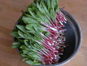 今日の収穫 酢味噌、卵とじ、また餃子の中へ、と食べ方はいろいろありますが、生でみそをつけても旨い。 さっとゆでて冷凍すると保存できます。また醤油漬けなども、良いですね。 この行者ニンニクは、このくらい太くなるには五年もかかるそうです、次の年のことも考え太いものだけを、根っこを残して収穫しましょう。 |
