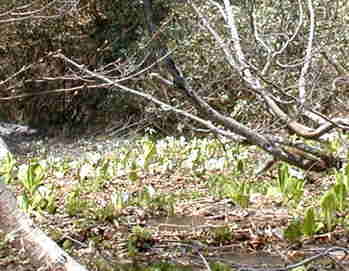 | 雪が解けた後には、 水芭蕉がもう花をつけています。 |
