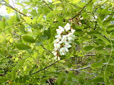 | わが家の入り口のハマナスも満開を過ぎました。 | 一番最初に咲いたわが家のニセアカシアです。 |