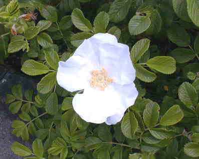 | 今年のハマナスは、陽気のせいか、花が大きく綺麗です。 | こんな白いハマナスもありますよこれは植えられたものですが、 少数ですが自生しているところもあるようです。 |