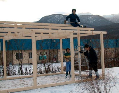 十二月になり建て始めたときには雪が降りだし 先が思いやられ |