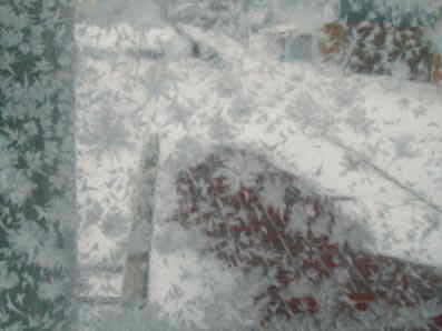| 寒さのため、ガラスに氷の結晶の花が咲きます。 | 強風のため屋根には雪はつもりません。 |